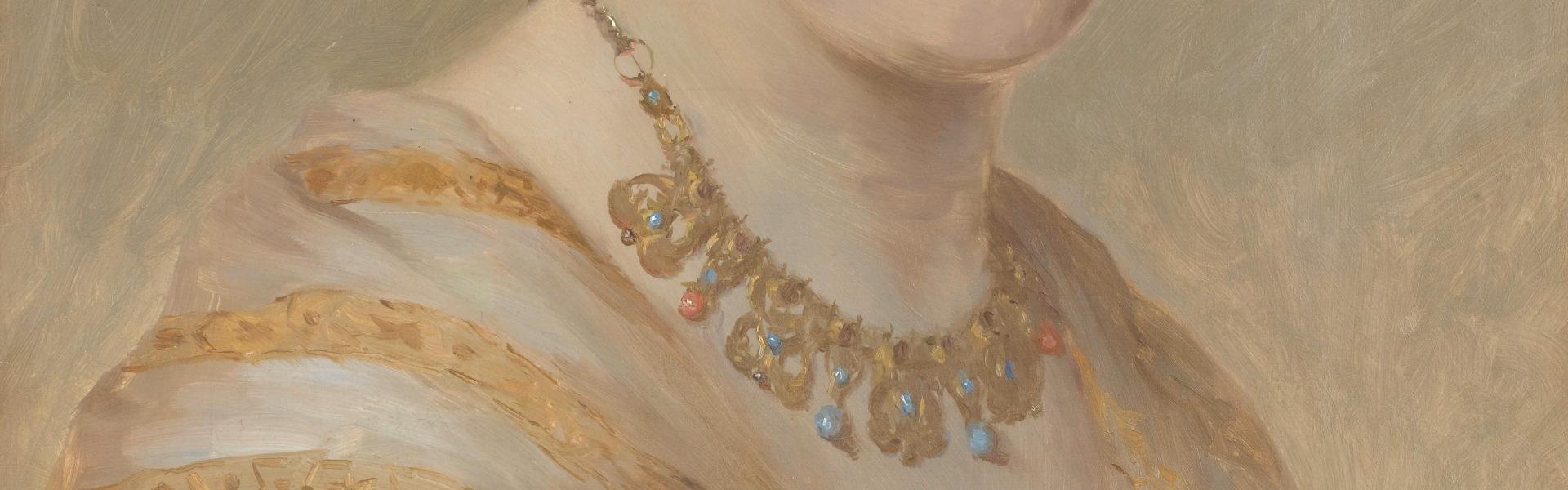 Une fine boucle d'oreille dans La Femme à l'éventail par Gustave-Jean Jacquet, un bracelet au poignet de madame Joseph Magnin sur une toile d'Aline Jauzion, des bagues aux multiples pierres précieuses sur le Portrait de femme par James Heath Millington... les peintures conservées au musée national Magnin regorgent de bijoux !